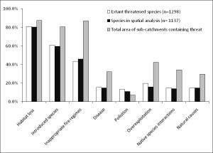 Figure 1. Relative impacts of major threatening processes expressed as the % of extant species threatened, the % of mapped species threatened (subset of extant threatened species for which spatial data were available), and the % of continental area of Australia across which the threat occurs within sub-catchments.