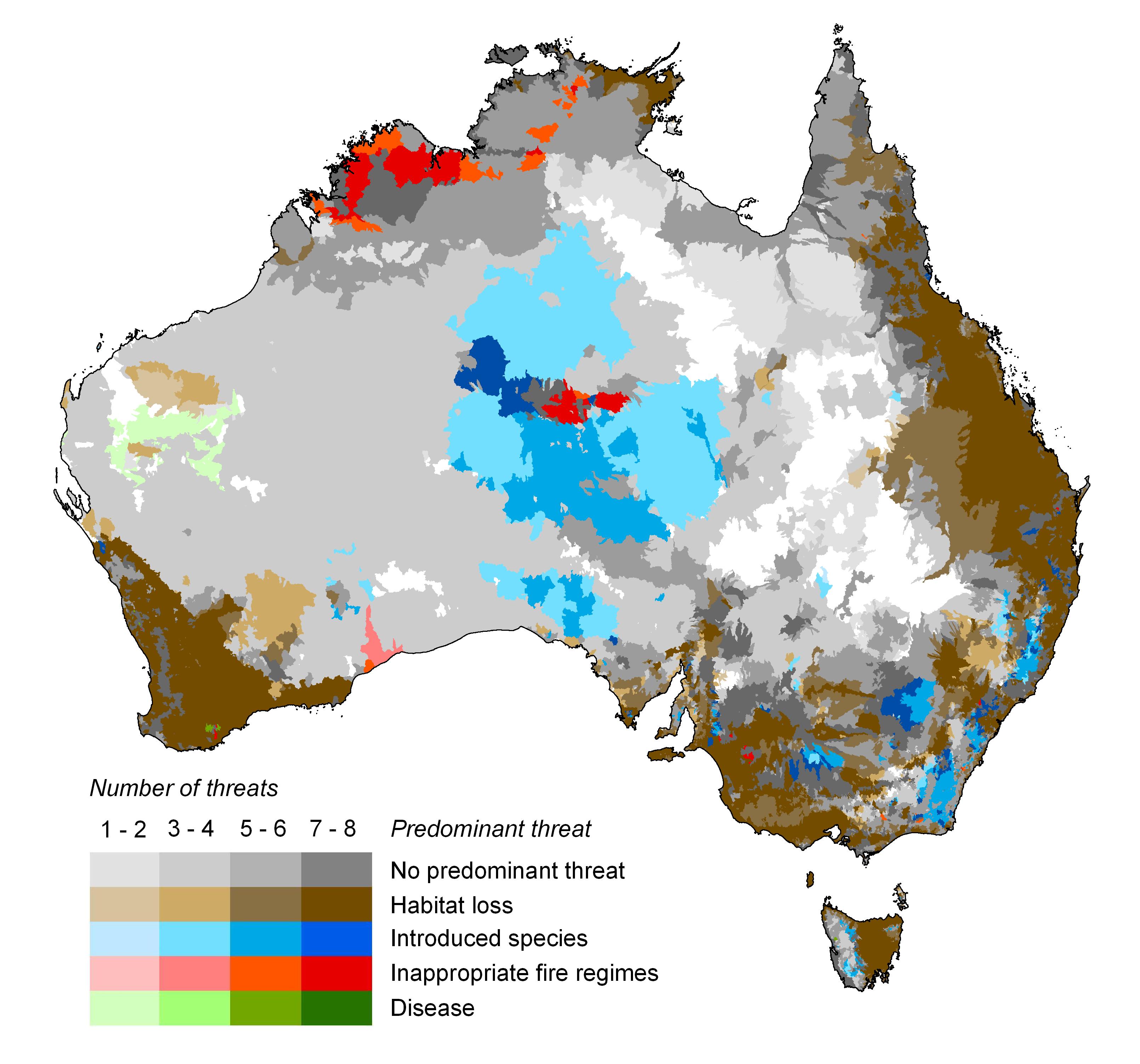 The reasons for the decline of Australia’s unique biodiversity are many, and most are well known. Clearing of vegetation for urban and agricultural land uses, introduced species and changed fire patterns are regularly cited in State of the Environment reports, recovery plans and published studies as major threats to biodiversity. But, while these threats are widely acknowledged, little has been done to quantify them in terms of the proportion of species affected, or their spatial extent at a national, state or local scale. To understand why such information on threats may be useful, consider for instance how resources are allocated in public health care1.