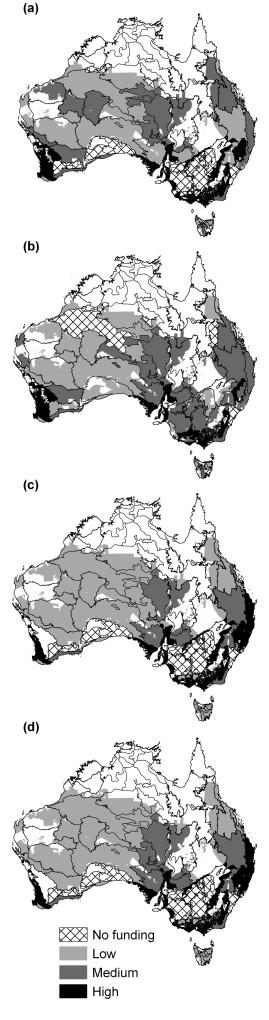 Figure 3. Investment into conservation actions at a continental scale for all 72 bioregions, according to our 4 return-on-investment (ROI) frameworks: (a) Two-action-independent ROI, (b) three-action-independent ROI, (c) action-dependent ROI and (d) action-dependent ROI with spatial targeting. Map shows the priority bioregions for investment as indicated by the total percentage of funding for a bioregion summed over all actions, which is shown as low (up to 1%), medium (up to 2%) or high (up to 6%).