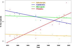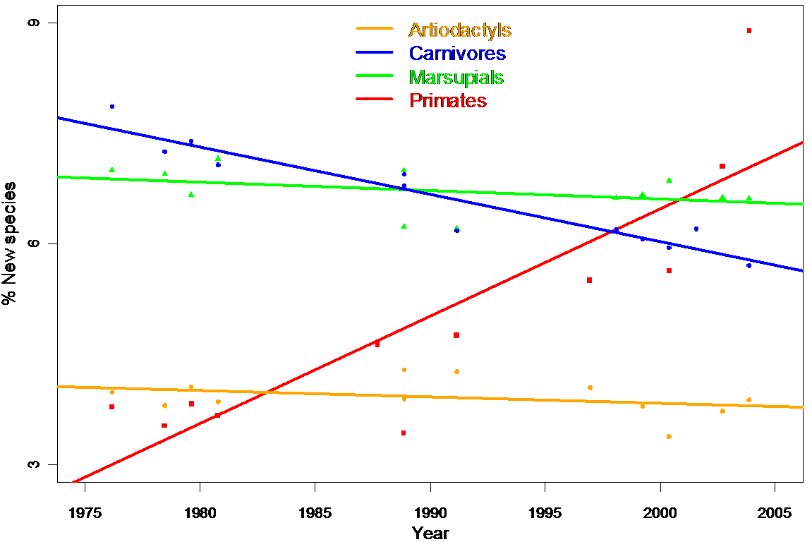 Temporal trend of annual % of newly described over total known species of 4 mammal orders (artiodactyls, carnivores, marsupials, primates) in taxonomic studies published 1980-2004 (ref 2). The expected slope for each order is negative, i.e., the proportion of new species should decrease as the cumulative number of known species increases over time. Primates are the only order showing a positive slope, and have become the third-most speciose vertebrate order, only topped by rodents and bats. Those values do not indicate real diversity in nature, but biased research effort.