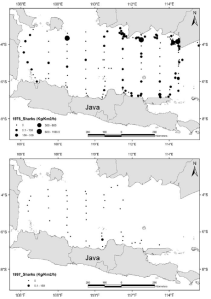 During our workshop, Rik pointed out a paper he had co-authored back in 2009 in Reviews in Fish Biology and Fisheries that had completely escaped my attention – it’s a frightening and apocalyptic view of the Australasian marine tropics that seems to confirm our predictions about northern Australia’s marine future. Just take a look at the following two figures from their paper (Elasmobranchs in southern Indonesian fisheries: the fisheries, the status of the stocks and management options):