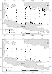 The left-hand maps are the catch rates of sharks in the Java Sea (north of Java, Indonesia), and the right-hand images are catch rates of rays. The top panels represent data collected during cruises done in 1976, and the bottom maps show the same area in 1997.