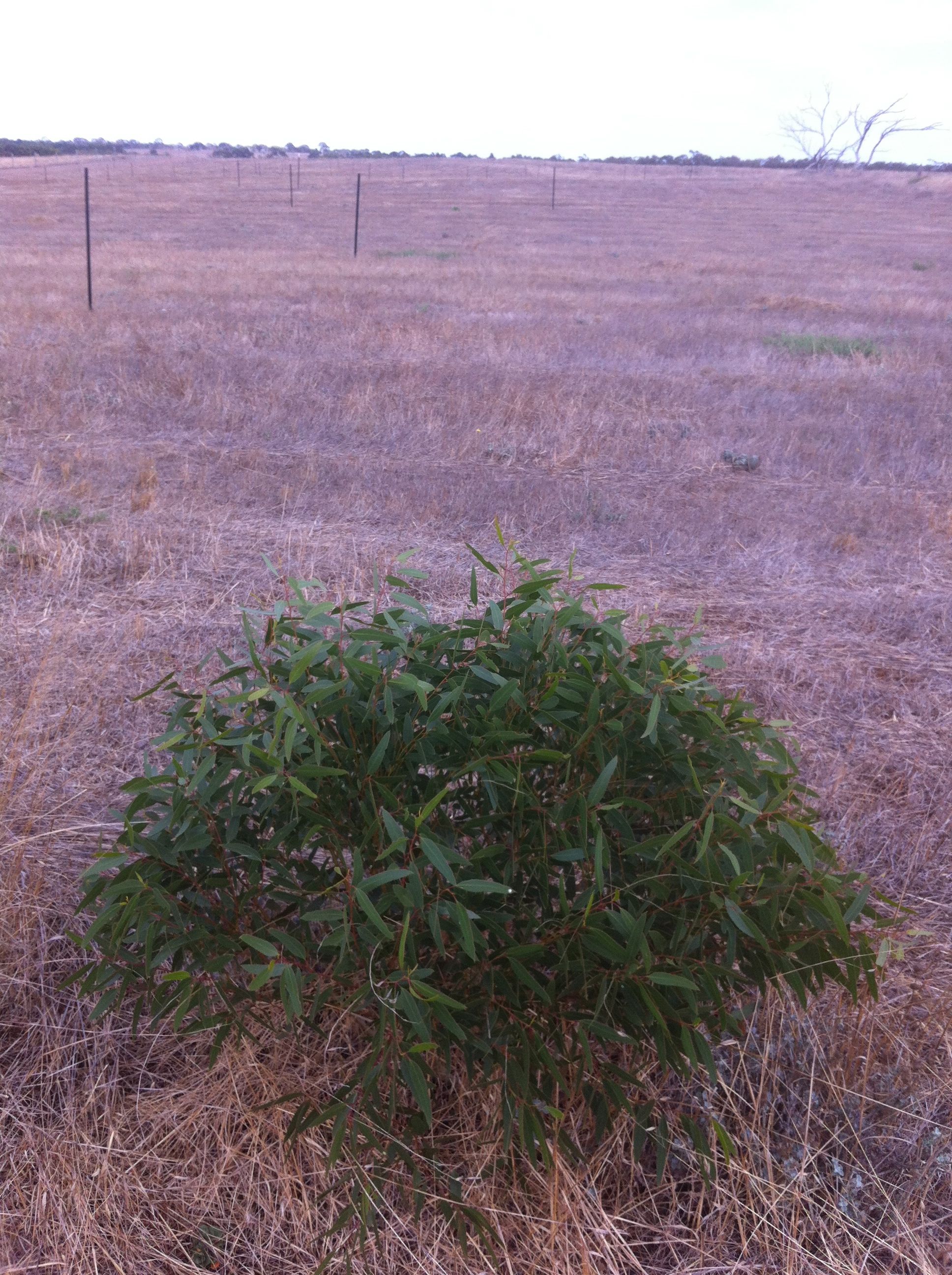 A tough little Eucalyptus porosa – one day soon this entire ex-paddock will be filled with carbon-guzzling natives. Note the plot markers in the background.