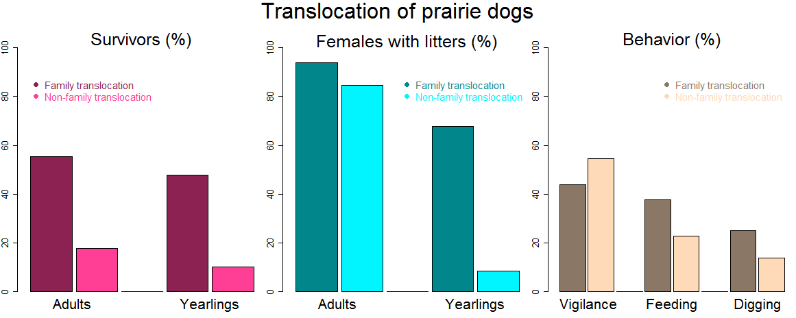 Debra Shier investigated the nuisances of a translocation of a social species such as the black-tailed prairie dog (Cynomys ludovicianus) [4]. Shier tagged, sexed and determined (via capture-recapture and field observations) membership to identified family clans in 973 individuals from Vermejo Park (New Mexico, USA). She then introduced clans to ten dog-free sites with soil quality and vegetation cover akin to the historical distribution of the species. In five of those sites, Shier translocated family clans (4 to 7 individuals per clan) and in the other five sites she freed clans made up of members being picked up randomly (1 male, 2 females, 2 juveniles). During a period of 9-10 months after translocation, Shier monitored the behaviour of females and ultimately re-captured all introduced individuals. She found that 50% of the dogs had survived translocation, and assumed that the remainder had died since individuals rarely disperse more than three km from their natal area, and aerial surveys spotted no dogs in a four-km perimeter around the point of release.