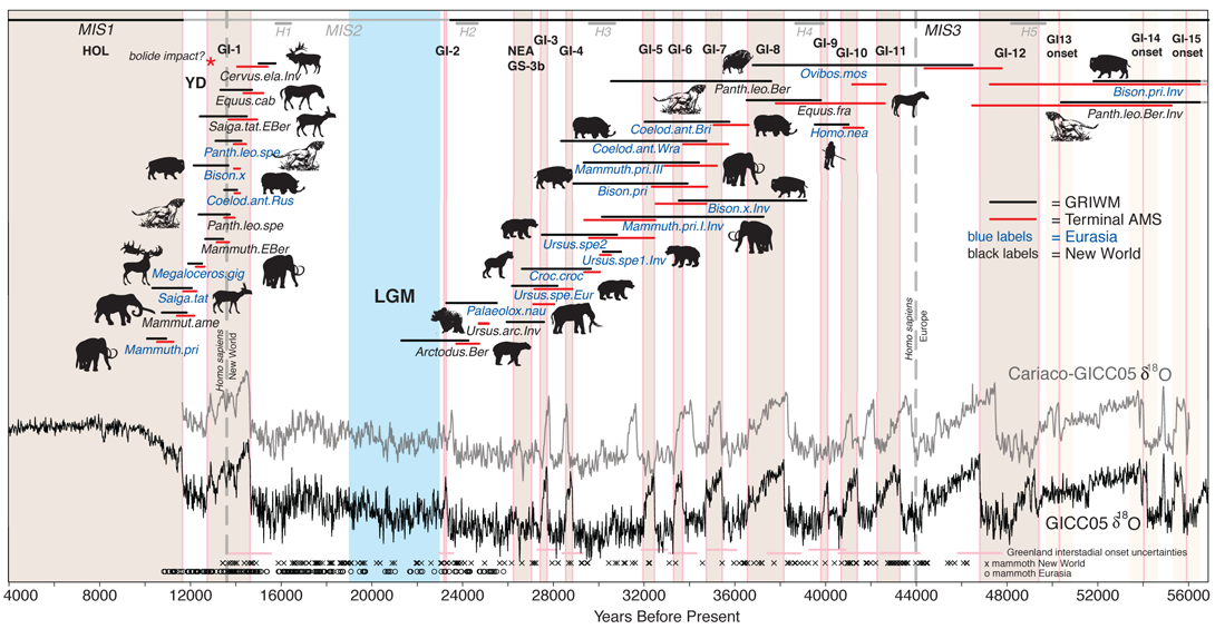 Just out today in Science, our long-time-coming (9 years in total if you count the time from the original idea to today) paper ‘Abrupt warmings drove Late Pleistocene Holarctic megafaunal turnover‘ demonstrates for the first time that abrupt warming periods over the last 60,000 years were at least partially responsible for the collapse of the megafauna in Eurasia and North America.