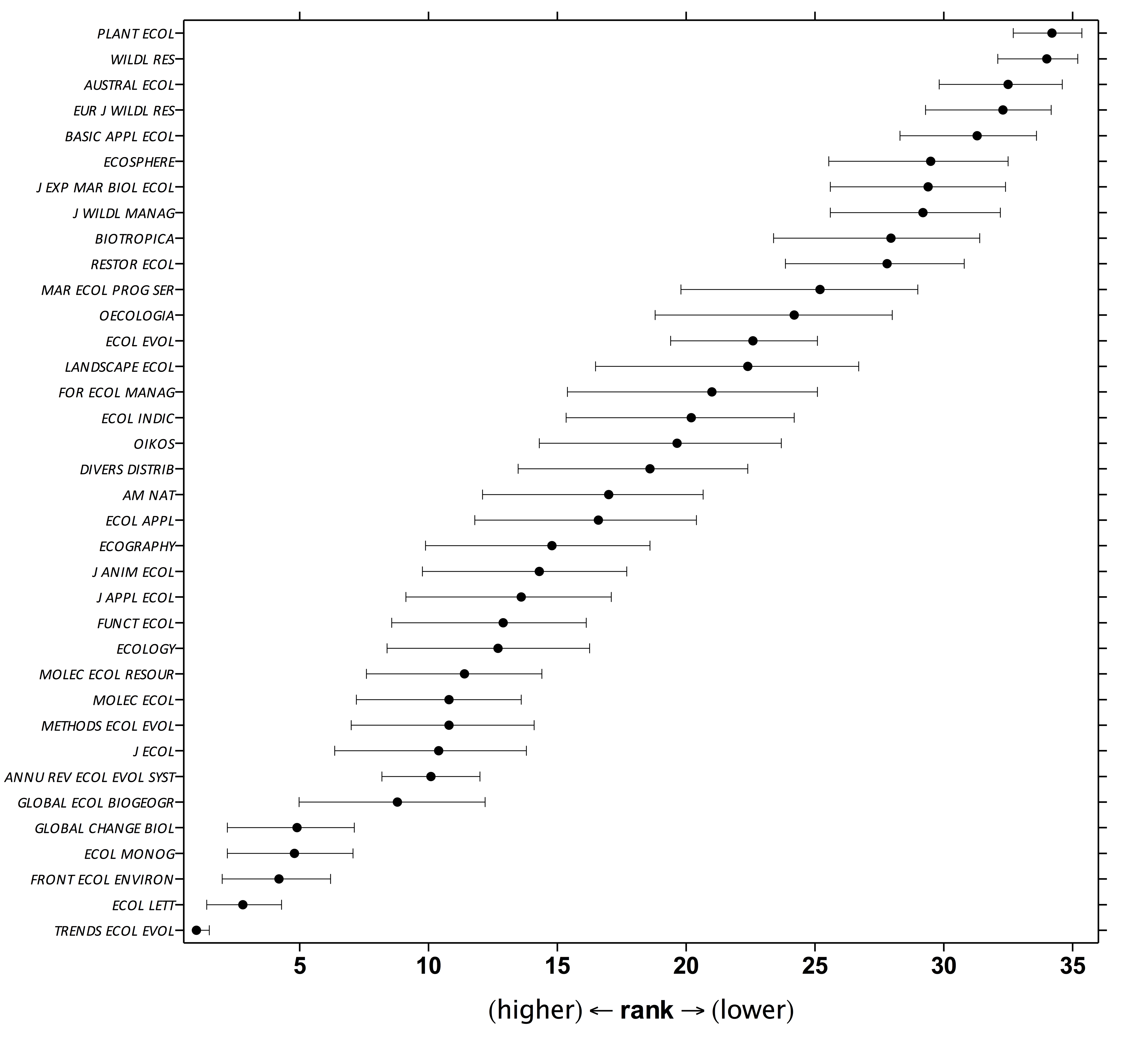 For example, here is the ranking of 36 Ecology-only journals from that larger list (again, this is not comprehensive):
