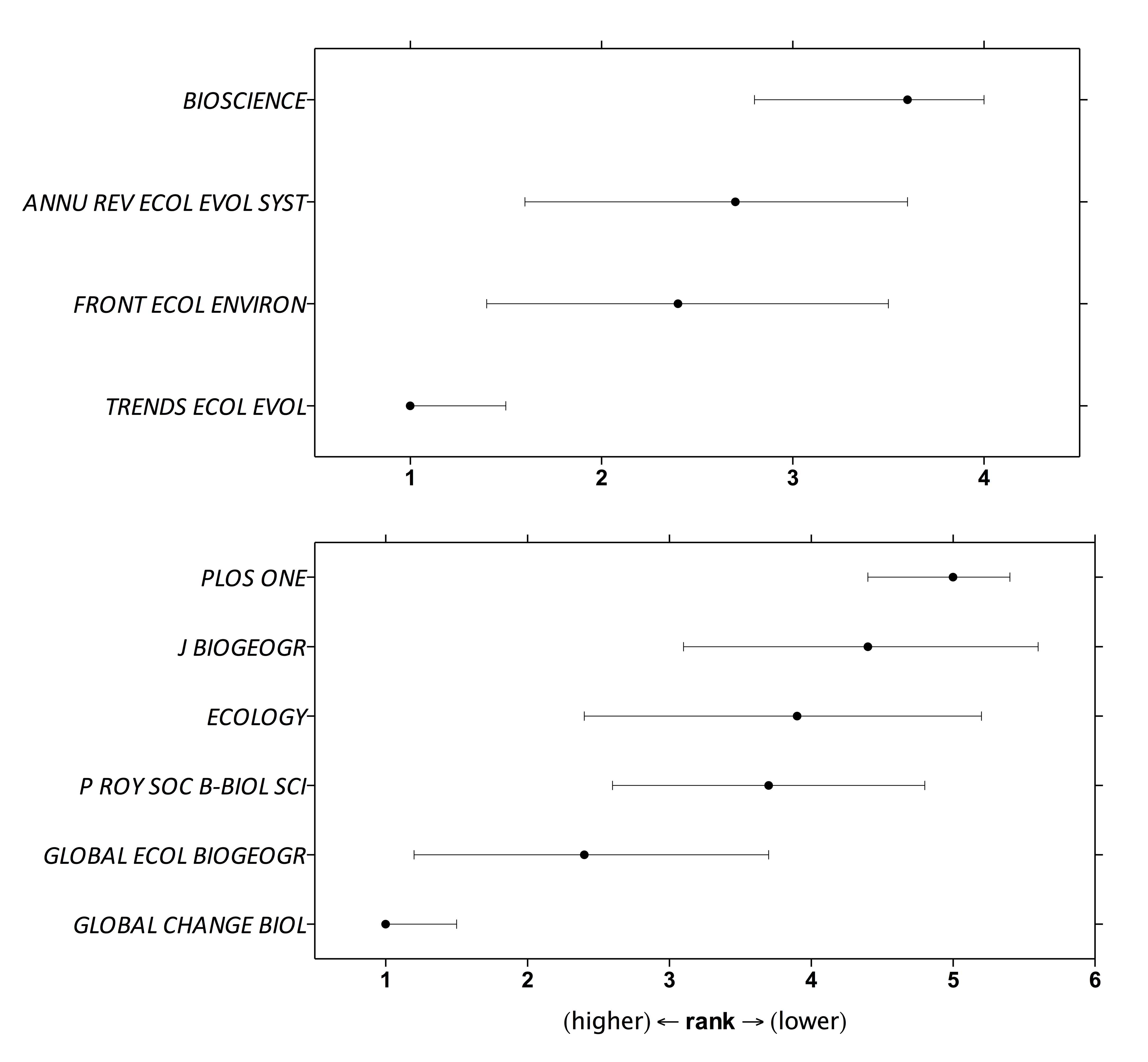 The top panel of the figure below shows the relative ranking of four ‘review’ journals in ecology/conservation. The bottom panel shows six journals where one might consider sending a manuscript with a ‘biogeography’ theme (I threw PLoS One in there as a multidisciplinary back-up option).
