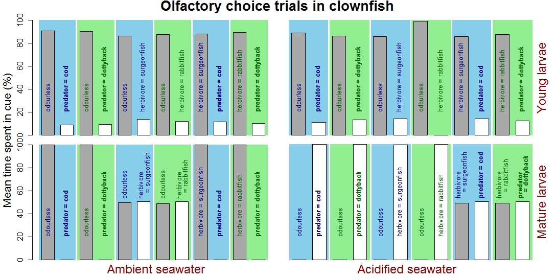 In ambient water, young larvae preferred odour-free tunnels rather than tunnels carrying predator or herbivore cues (indicating smell discrimination of other species is not developed in newly born clownfish). In contrast, mature larvae only avoided tunnels scented with predators (indicating smell discrimination is already developed prior to recruitment, hence emerges between clownfish birth and adulthood). However, in acidified water, the choice of young larvae remained the same, but mature larvae lost their capacity of telling friend from foe.