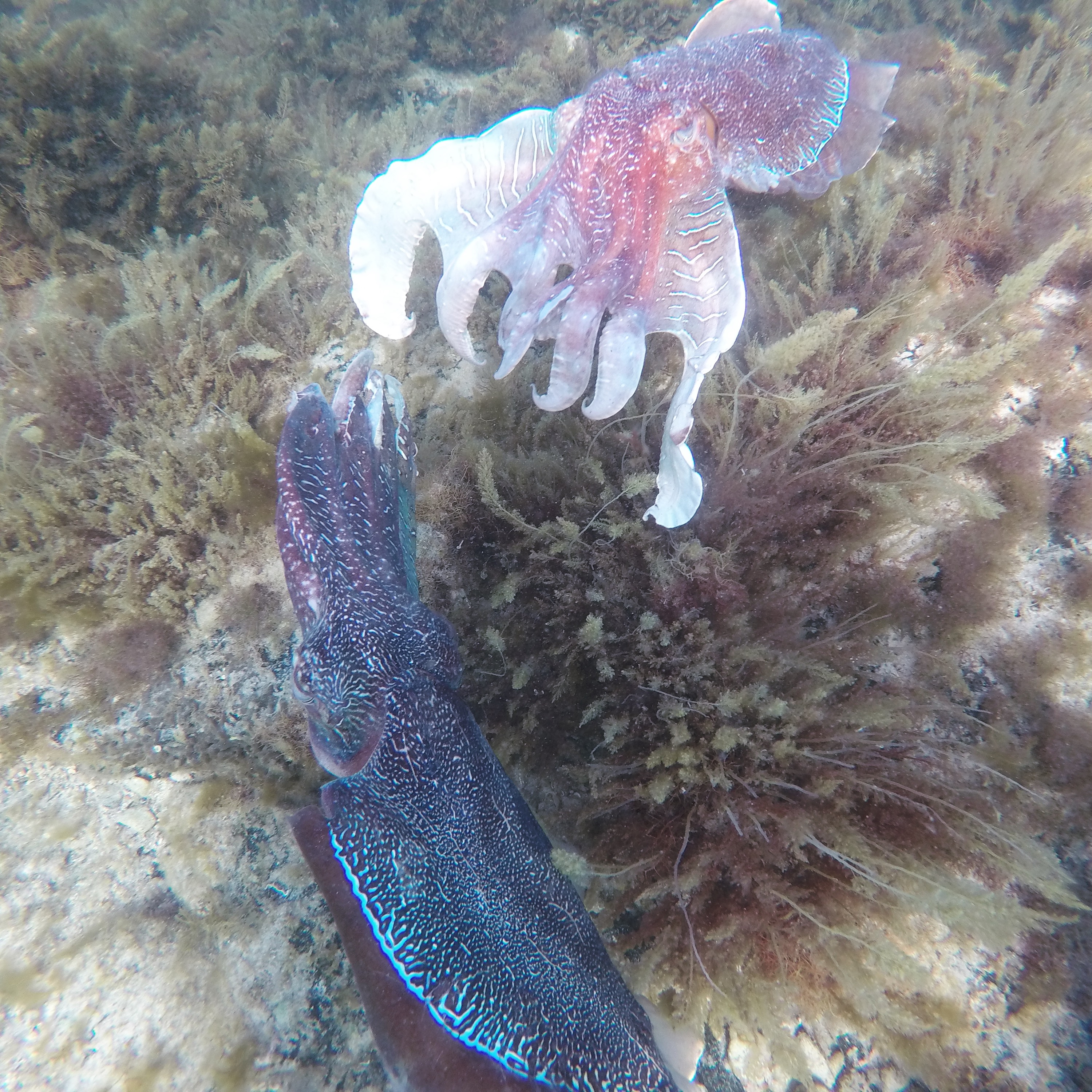 Armed with a mate’s GoPro camera, I was able to do a little filming, but even these beautiful images don’t do the species justice (check out some videos and more images on my Instagram feed). The shifting colours and body forms of these rather large and gentle cephalopods (some males can exceed 1 metre in length) blew my noodle. I was also rather stunned just how close to shore they aggregate (only 10-15 metres out) and how shallow they come (sometimes less than 2 metres depth). In other words, even young children able to breathe through a snorkel can get up close and personal with the cuttlefish.