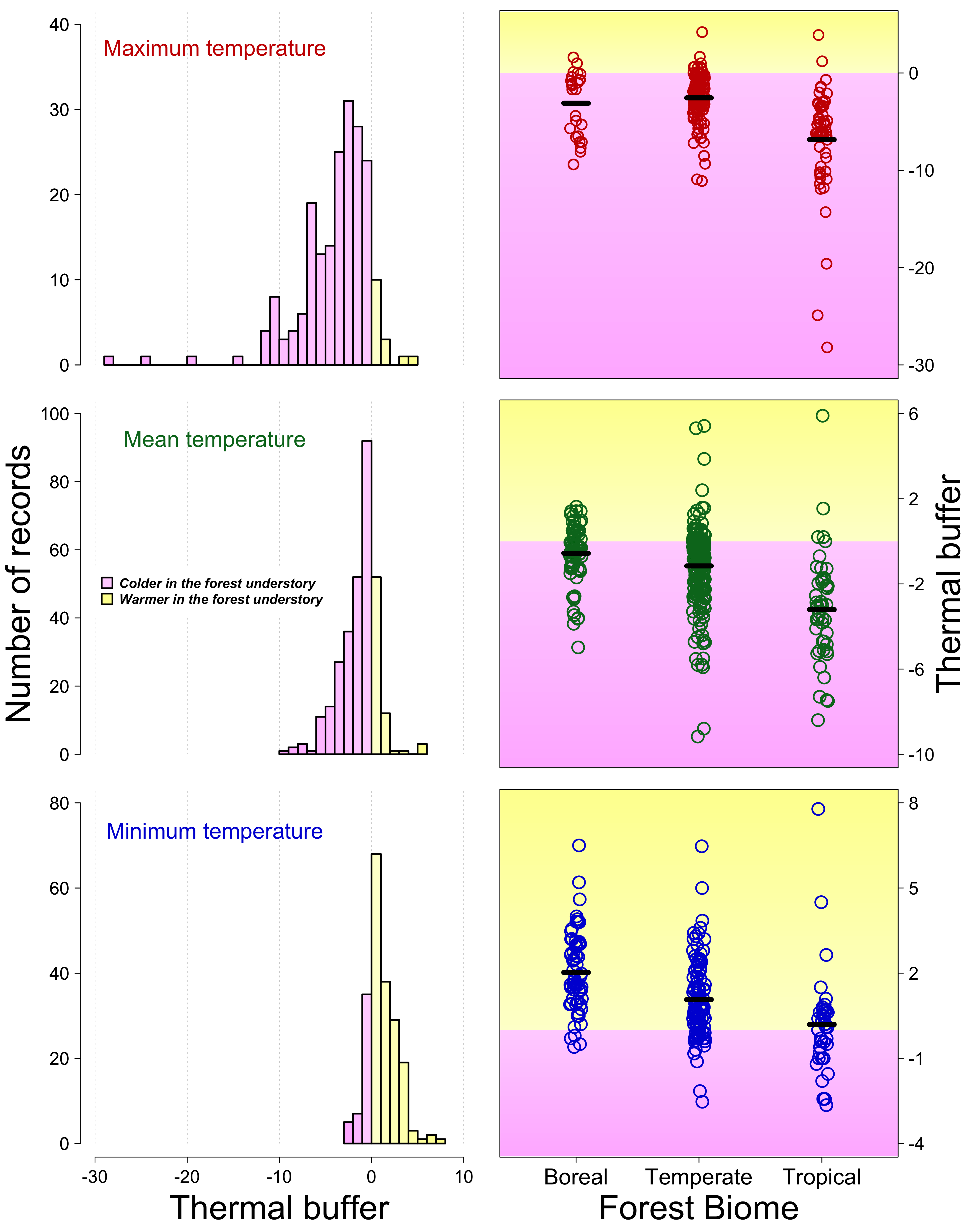 Forest insulation function (thermal buffer) characterised from 714 records of maximum, mean and minimum temperatures taken in 98 sites through 31 countries in three biomes and five continents (6). The inclusion of three biomes guarantees a latitudinal gradient of increasing maximum temperatures towards the tropics, and decreasing minimum temperatures towards the boreal region. The thermal buffer is the difference of understory temperatures minus temperatures in neighbouring treeless areas. Thus, negative (purple) and positive (yellow) values indicate colder or warmer temperatures inside the forest, respectively (black, bold line = mean). The forest understory tends to remain warmer when outside temperatures are high (maximum), and this is more frequent in the tropics. Alternatively, the forest understory tends to stay warmer when outside temperatures are low (minimum), and this mainly occurs in boreal forests. Mean temperatures tend to be lower in the understory.
