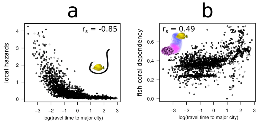 We then explored how the degree of ecological dependency changes with remoteness, quantified as travel time from the target location to the closest human settlement. We found that the dependency between fish and corals becomes stronger with distance from humans (Fig. 1b). That is, remote reefs are those where the impact of coral mortality events might affect the largest proportion of fish species.
