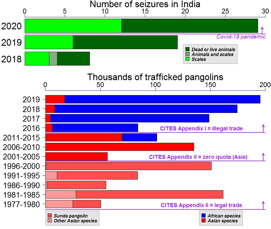 Knowing the pangolin-coronavirus connection, Vikram Aditya and collaborators browsed the internet for cases of illegal pangolin trade in India from 2018 to 2020 (14). They found a total of 111 seizures, of which 65% were dead or living animals and the remainder consisted of scales. Due to the Covid-19 pandemic, the Indian population was locked down between March and May 2020, and followed gradual relaxation of social distancing over the rest of the year. However, from March to August annually, there were 10 to 20 more pangolin seizures in 2020 than in 2018 or 2019. So, illegal trade of pangolins increased the year of the SARS-CoV-2 irruption according to internet data.