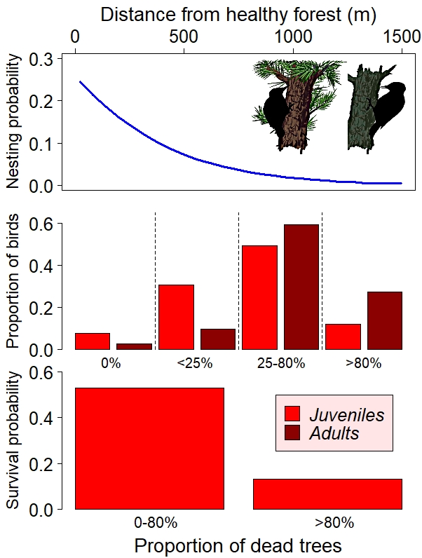 Stillman and his team estimated that nesting probability on dead trees increases with the extent of wildfires, but nests are more common near the border between forest fragments subjected to low and high fire severity (8). Further, when juveniles leave their nests, they use fragments of intact or mildly-burned forest much more frequently than adults (9). And when juveniles use forest areas with less than 80% tree mortality, their chance of surviving within the first month after birth increases by a factor of four (7).