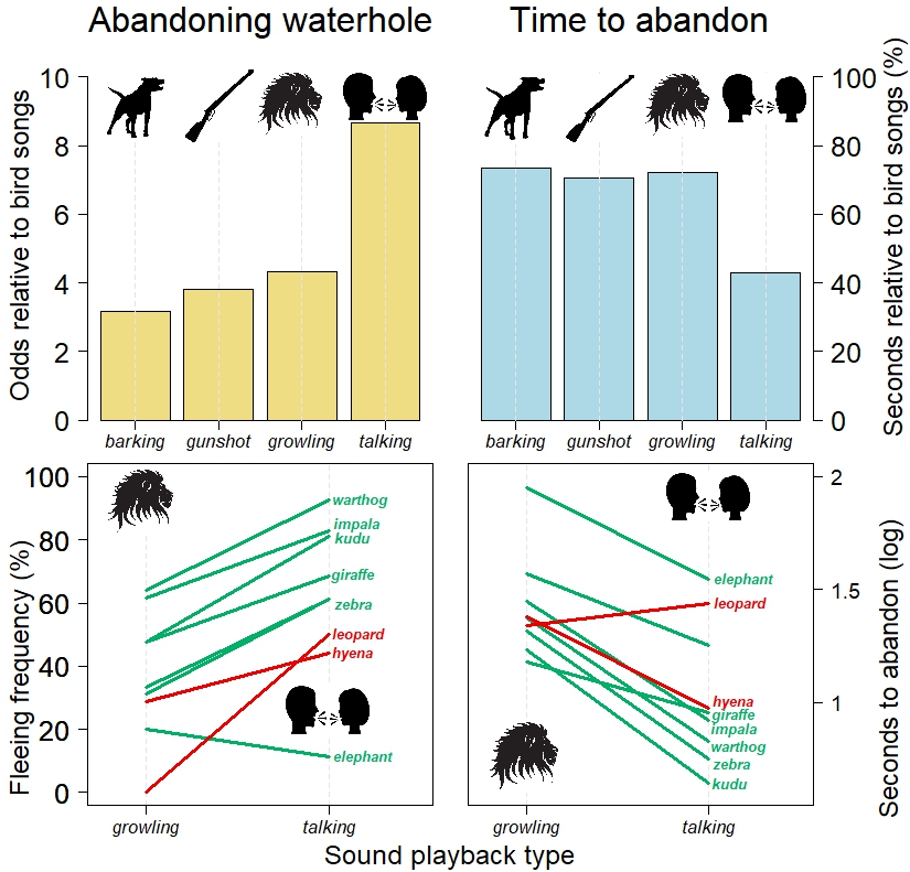 Liana Zanette and her team measured the flight responses of wild mammals in the Greater Kruger National Park (South Africa) when exposed to sounds that signal danger (7) [video-summary]. To do this, Zanette recorded videos of more than 4,000 visits to 21 waterholes by 18 mammal species. During each visit, a speaker attached to a tree randomly played one of five playback sounds: hunting dogs barking, gunshots, lion growls, human conversations in a calm tone and, as a control, the songs of harmless birds.