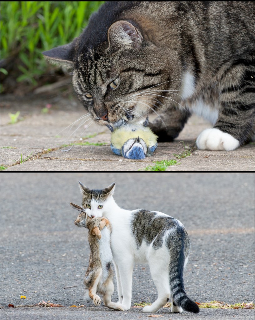 Domestic cats are highly skilled hunters, and their predatory interactions with a wide range of prey are widely documented in social media and documentaries. Some examples include cats catching: bats and birds on the wing, butterflies, chipmunks, dragons, fishes, grasshoppers, frogs, lizards, mice, owls, rabbits, seagulls, snakes, squirrels, and wallabies. See an award-winning photo depicting wildlife with fatal injuries caused by cats recorded in 2019 at a single animal hospital in the USA, and a video showing domestic cats mimicking bird calls and some cat owners explaining that their pets reject commercial cat food after experiencing the thrill of hunting real prey. The documentary Secret Life of Cats contextualises the ecological challenges posed by free-roaming cats.