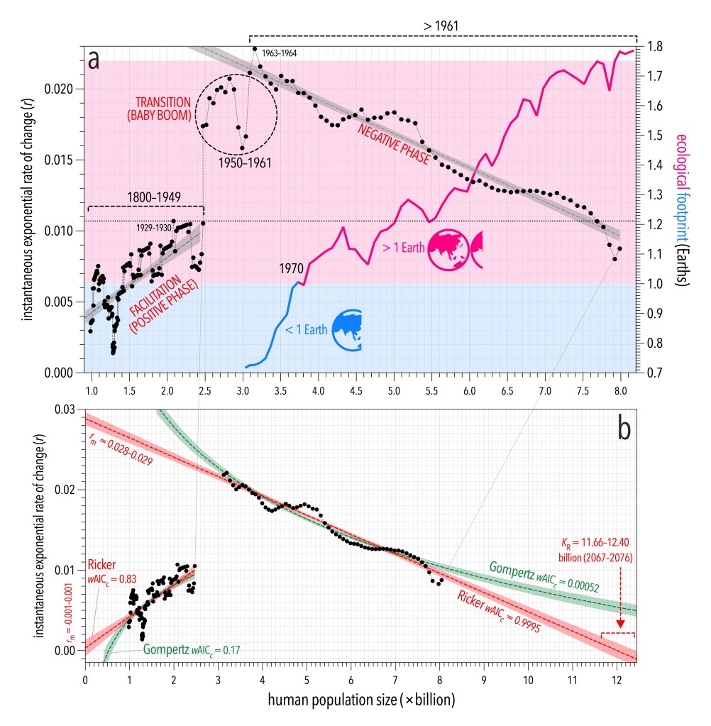 (a) Relationship between the instantaneous (annual) exponential rate of change (r = loge(Nt+1/Nt) and population size (N) at year t from 1800 to 2023. There is a positive relationship between r and Nt from 1800 to 1949, indicating facilitation. The dotted horizontal line intersecting 1929–1930 indicates the highest r observed during the facilitation phase (0.011). Following WWII through the 1950s, there was a period of transition toward high r, but no relationship with Nt, and then the establishment of a negative r ∼ Nt relationship from around 1961–1962 to the present. Also shown on the right y axis is the ecological footprint expressed in terms of number of Earth’s required to meet global human consumption — at 1 ‘Earth’, the global ecological footprint (ecological assets the global population requires to produce the natural resources it consumes and to absorb its wastes) equals the Earth’s biocapacity (productivity of ecological assets, including cropland, grazing land, forest land, fishing grounds, and built-up land). The global ecological footprint has exceeded the Earth’s biocapacity since 1970 (transition from blue to pink). (b) Ricker and Gompertz logistic relationships for the facilitation and negative phases (Akaike’s information criterion weights wAICc shown for each model for each phase) indicate most support for the Ricker model. Extending the fitted Ricker relationship between r and Nt to where r (y) = 0 indicates maximum (biophysical) global population size (KR = −intercept ÷ slope). Assuming no deviation from this expected relationship, KR = 11.66–12.40 billion people predicted to occur between 2065 and 2074. Red (Ricker) and green (Gompertz) shading around logistic fits indicate 95% confidence intervals.