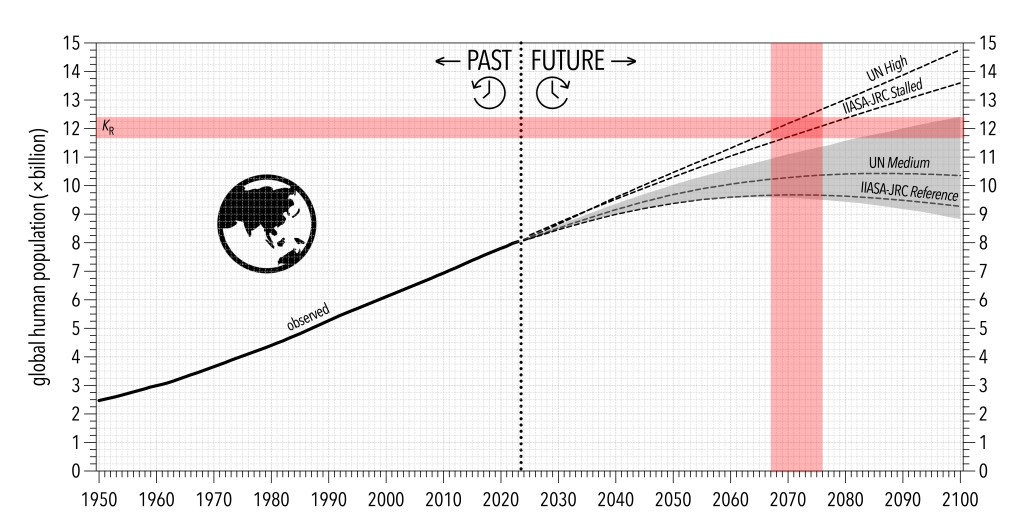 Past trajectory and future projections of the global human population from the most-plausible models of the United Nations (UN) and IIASA-JRC. Dotted black lines are the Medium and High scenarios from the UN, and the Reference and Stalled scenarios from the IIASA-JRC; grey-shaded area is the 95% confidence interval for the UN Probabilistic Population Projections. Red shading indicates the maximum human carrying capacity derived from the Ricker model (KR = 11.66–12.40) and timing (2067–2076).