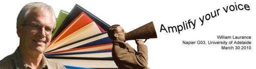 His first talk (on Monday 29 March) will be an in-house Environment Institute seminar, but the second two will be public events that I urge anyone remotely interested in biodiversity conservation research to attend. In fact, his Tuesday 30 March presentation (18.00-20.00 Napier G03, University of Adelaide) is even more generic than that, and word on the street is it is highly entertaining and extremely well attended wherever Bill’s is gracious enough to give it: