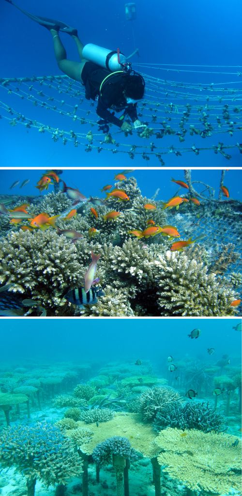 Aspects of coral gardening. The photos show (top) a diver scraping off (with the aid of a toothbrush) algae, sponges and parasites that compete for light and nutrients with the coral fragments under cultivation along suspended ropes (Cousin Island, Seychelles), (middle) coral outplantings in the Gulf of Eliat (Red Sea) hosting a diverse community of fish that clean off the biofouling for free (21), and (bottom) a donor colony farmed off Onna (Okinawa, Japan) (12). Photos courtesy of Luca Saponari (Cousin), Buki Rinkevich (Eliat) and Yoshimi Higa / Onna Village Fishery Cooperative.