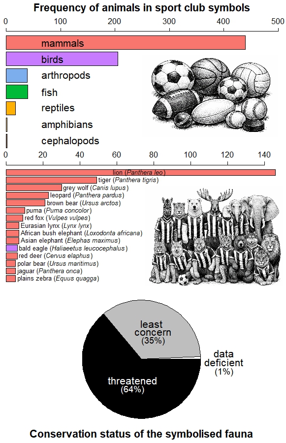 Animal symbols in club iconography (names, logos, fan nicknames) for the sports with the largest audiences (6): basketball, handball, baseball, cricket, football, American football, ice hockey and volleyball. The sample excludes 106 teams that use domesticated species as identity symbols, includes 163 men’s leagues and 67 women’s leagues, respectively, and the animal species depicted in the emblems of 48 teams could be identified. Horizontal bars above show the most represented animal groups (top panel), and the 15 species most frequently featured (middle panel). Bottom panel: percentage of symbols according to the IUCN’s conservation status of the species, where ‘threatened’ includes the categories Near Threatened, Endangered and Extinct. The trend indicates that sport clubs prefer to identify themselves with large mammal species that are threatened.