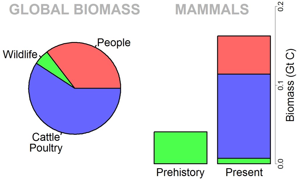 On the other hand, Yinon Bar-On et al. (8) quantified that the biomass of humans and our domesticated mammals currently multiplies the biomass of wild mammals by a factor of 10, and there are 3 kg of humans and poultry for every kg of wild birds (see video featuring this study).