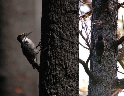 The black-backed woodpecker (Picoides arcticus) lives in the coniferous forests of North America’s boreal-Mediterranean region. Thanks to a powerful and sharp bill, this bird can excavate nests inside the trunks of (mainly dead) trees, and those cavities will be re-used later by many species of birds, mammals, and invertebrates in fire-prone landscapes (22). The images show a male with the characteristic black plumage of his back that serves as camouflage against the dark bark of a dead tree three years after a wildfire in Montana (USA). Being omnivores, the diet of this bird largely relies on the larvae of woodboring coleoptera like jewell and longhorn beetles. These insects are abundant post-fire, the champion being the fire beetle (Melanophila spp.). The thorax of fire beetles is equipped with infrared-light receptors that can detect a wildfire from tens of kilometres away (23). These fascinating little beasts are the first to arrive at a burned forest and, of course, woodpeckers follow soon after. The preference of the blackbacked woodpecker for burned forests and their cryptic feathers and pyrophilic diet reflect a long evolutionary history in response to fires. Courtesy of Richard Hutto.